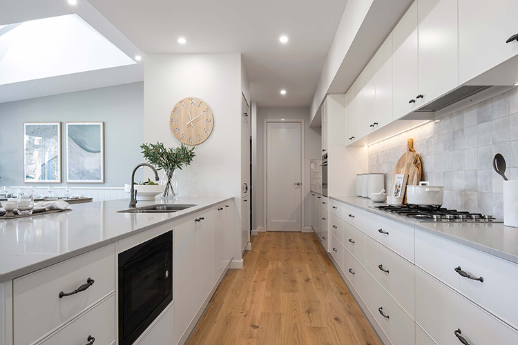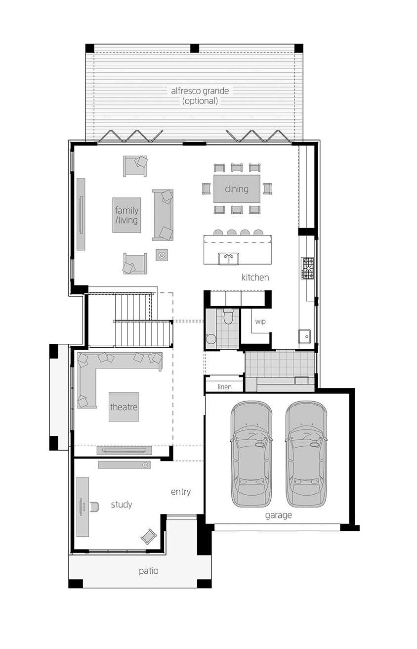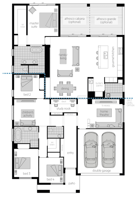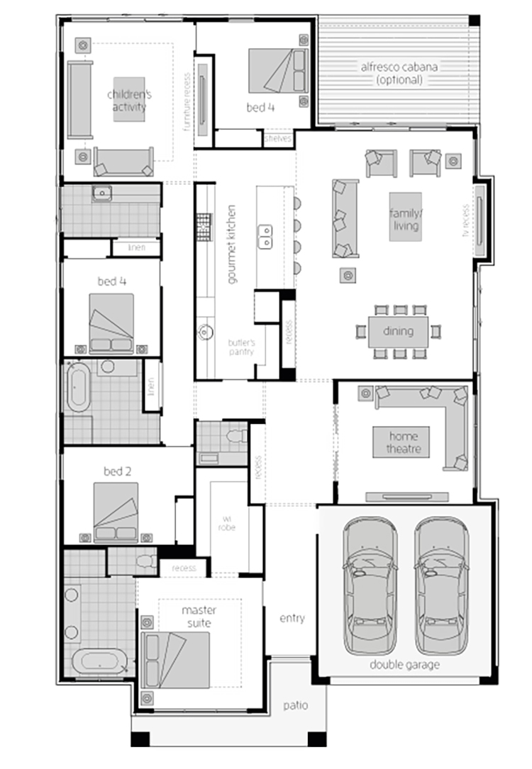 The luxurious new Retreat Executive from the McDonald Jones Stuart Everitt collection showcases the best of modern design with effortless flow between the spacious living zones and private quiet spaces, perfect for modern lifestyles. The beautifully designed galley kitchen is designed to delight the home chef with practicality, ease and style. Active families will love the highly functional layout, offering easy access through the butler’s pantry to home theatre and bedrooms wing for the ultimate convenience and connectively.